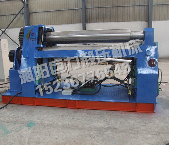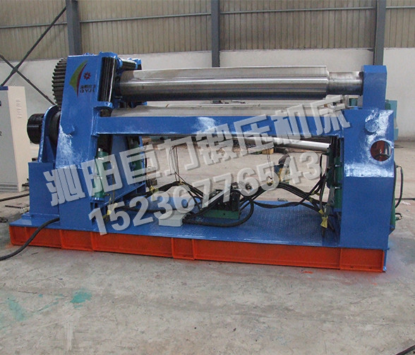 該機型的上輥固定,兩下輥呈傾斜狀做旋轉(zhuǎn)運動,兩下輥可以同時升降,也可以單升單降,用以完成板材的端部預(yù)彎。